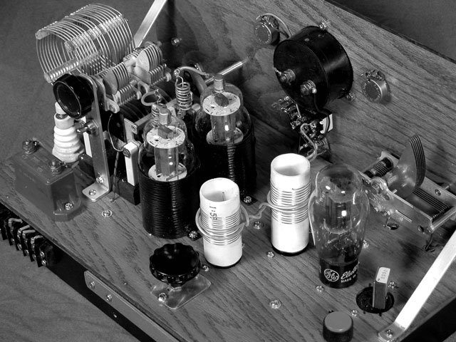 This photo shows the home-built shields for the 807 Push-Pull output stage. It was fun to build, but after building on metal chassis it is very difficult using a plywood chassis. I made one QSO using this rig. It was with Ray Osterwald, N0DMS, Editor of Electric Radio Magazine. After our QSO the rig was relageted to display status.