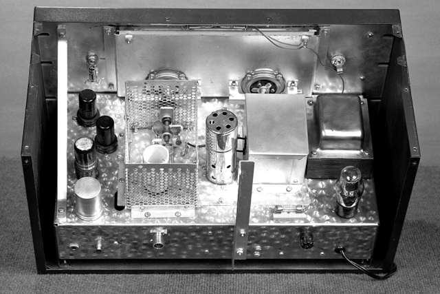 A look inside shows why this receiver is the most stable receiver I’ve built. The tube beside the power transformer is a VR tube to regulate detector voltage.
