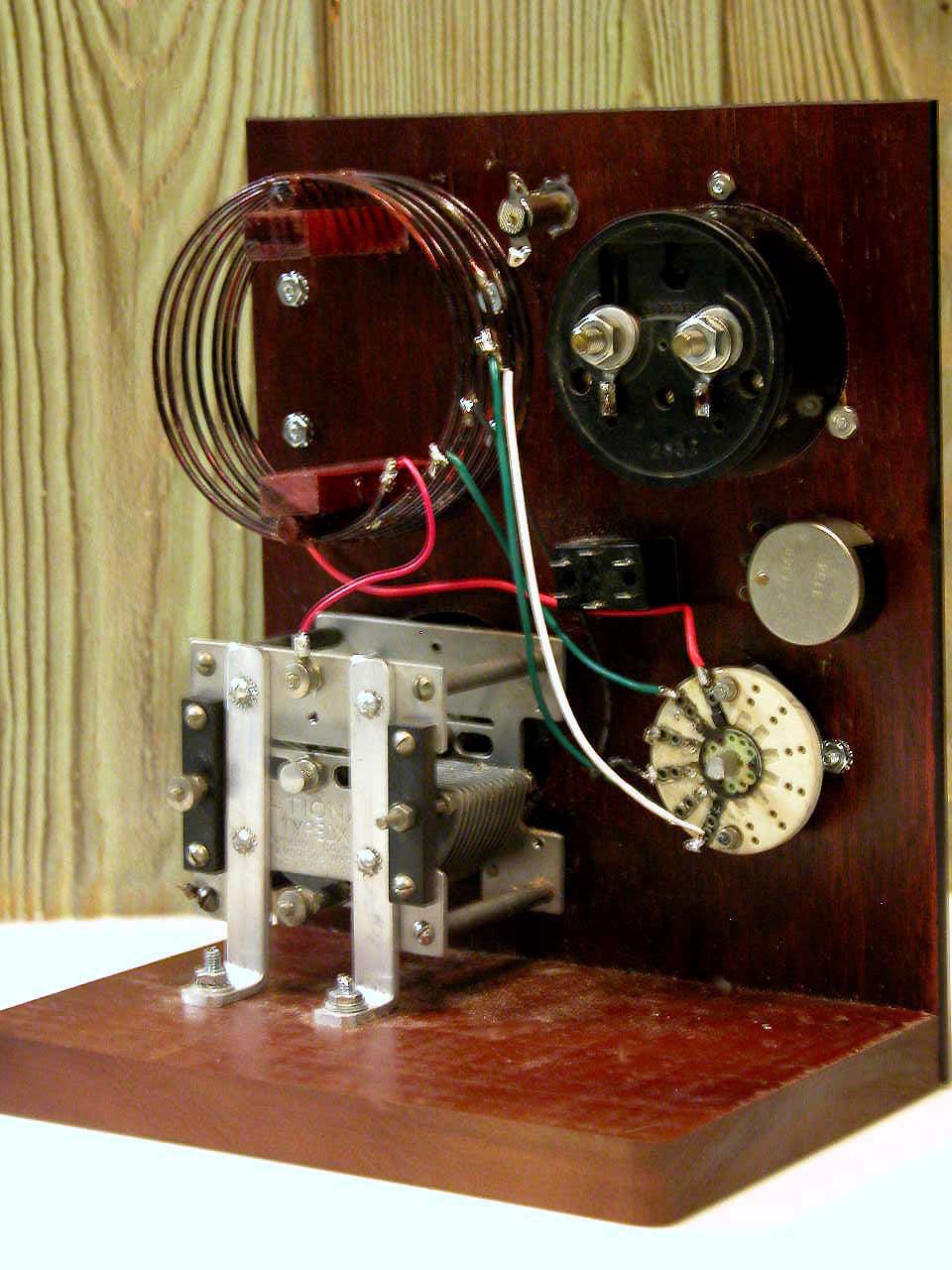 The meter was not completed in this photograph. It is finally finished. The toggle switch enables me to use either the meter or the pilot bulb when tuning up. The pickup loop is mounted on a long wood handle—see photo No 1. I no longer feel safe poking my hand in a rig with 1500 volts running loose.